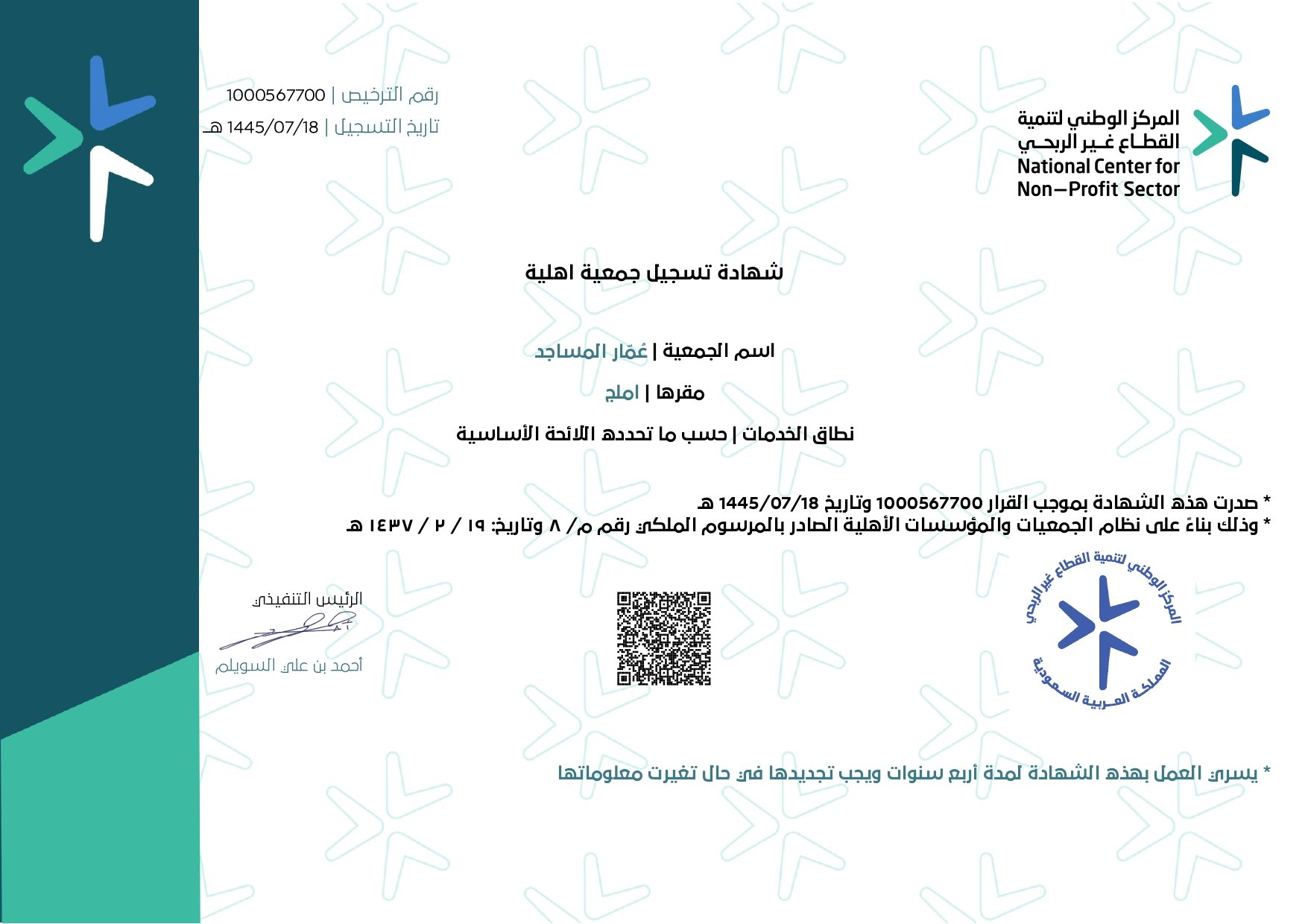 جمعية عمّار المساجد: مؤسسة غير ربحية تعمّر بيوت الله ببناء المساجد وترميمها، وصيانتها لتكون عامرة بالسكينة، وتقدّم مبادرات تثقيفية واجتماعية، بإشراف المركز الوطني لتنمية القطاع غير الربحي بشراكة مع وزارة الموارد البشرية والتنمية الاجتماعية، ووزارة الشؤون الإسلامية، برؤية أثر وطني مستدام.